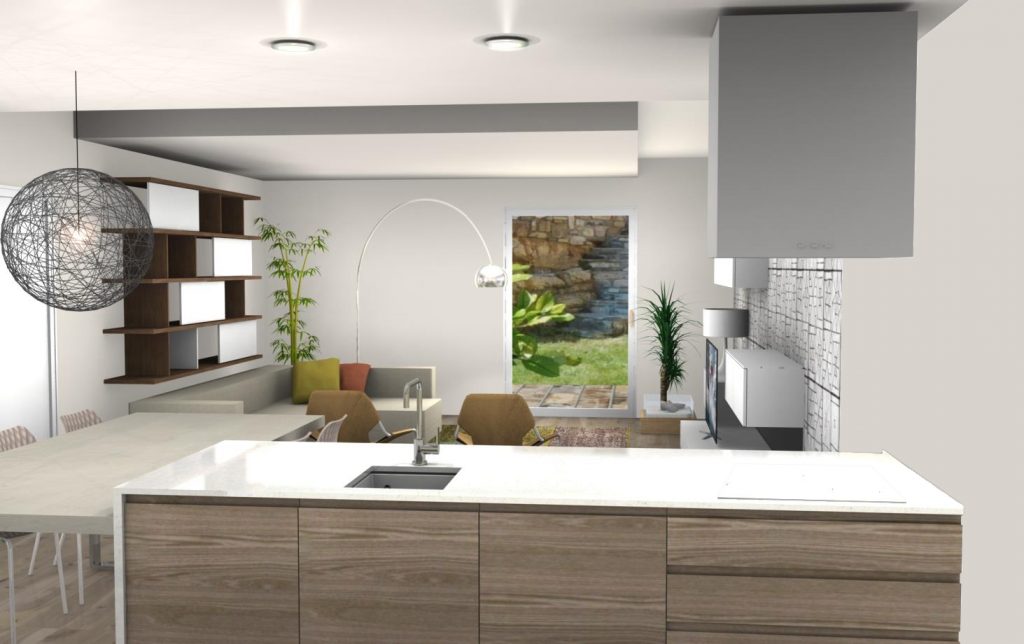 Progetto cucina, ribassamenti e illuminotecnico per abitazione privata: cucina modello Motus decorativo olmo juper e laccata opaca, parete porta tv laccata opaca bianca e libreria retro divano laccata beige e decorativo rovere