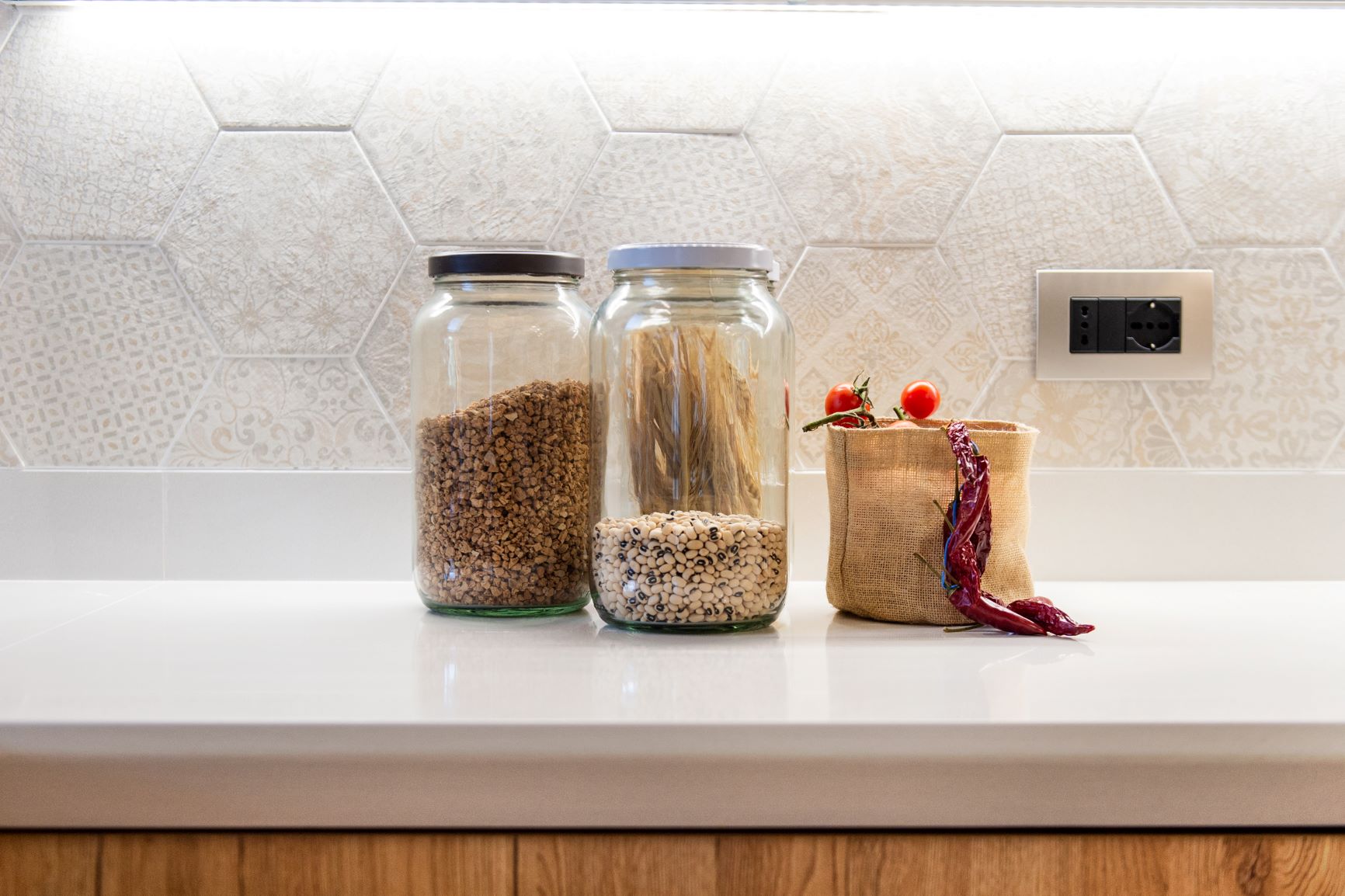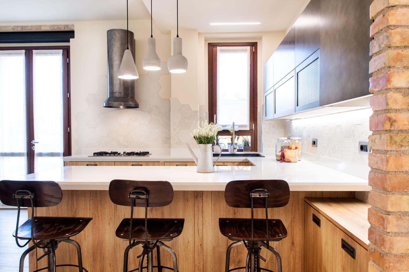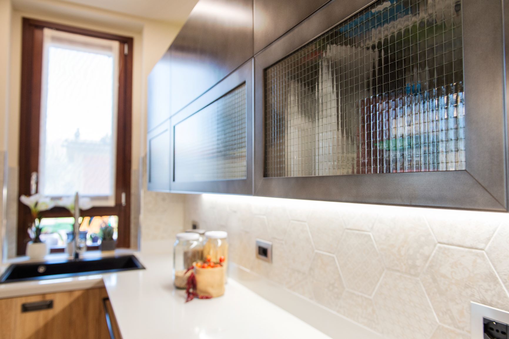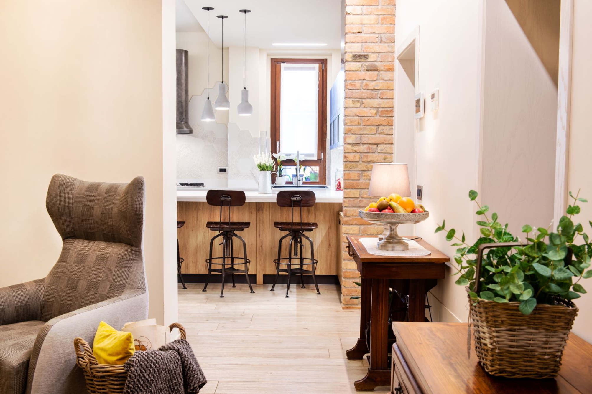In questo lavoro l’ingresso di un’abitazione lascia subito spazio ai ricordi di famiglia, il muro con mattoni a vista fatto dal nonno e la vecchia macchina da cucine della nonna. Il tutto inserito e contestualizzato con nuovi mobili dagli echi retrò chic. Nella zona giorno si richiedeva molto spazio contenitore, libertà di passaggio e movimento, vetrine in cui inserire gli oggetti in legno fatti dal papà, un comodo divano su cui poter allungare all’occorrenza le gambe e appoggiare la testa per guardare la tv.