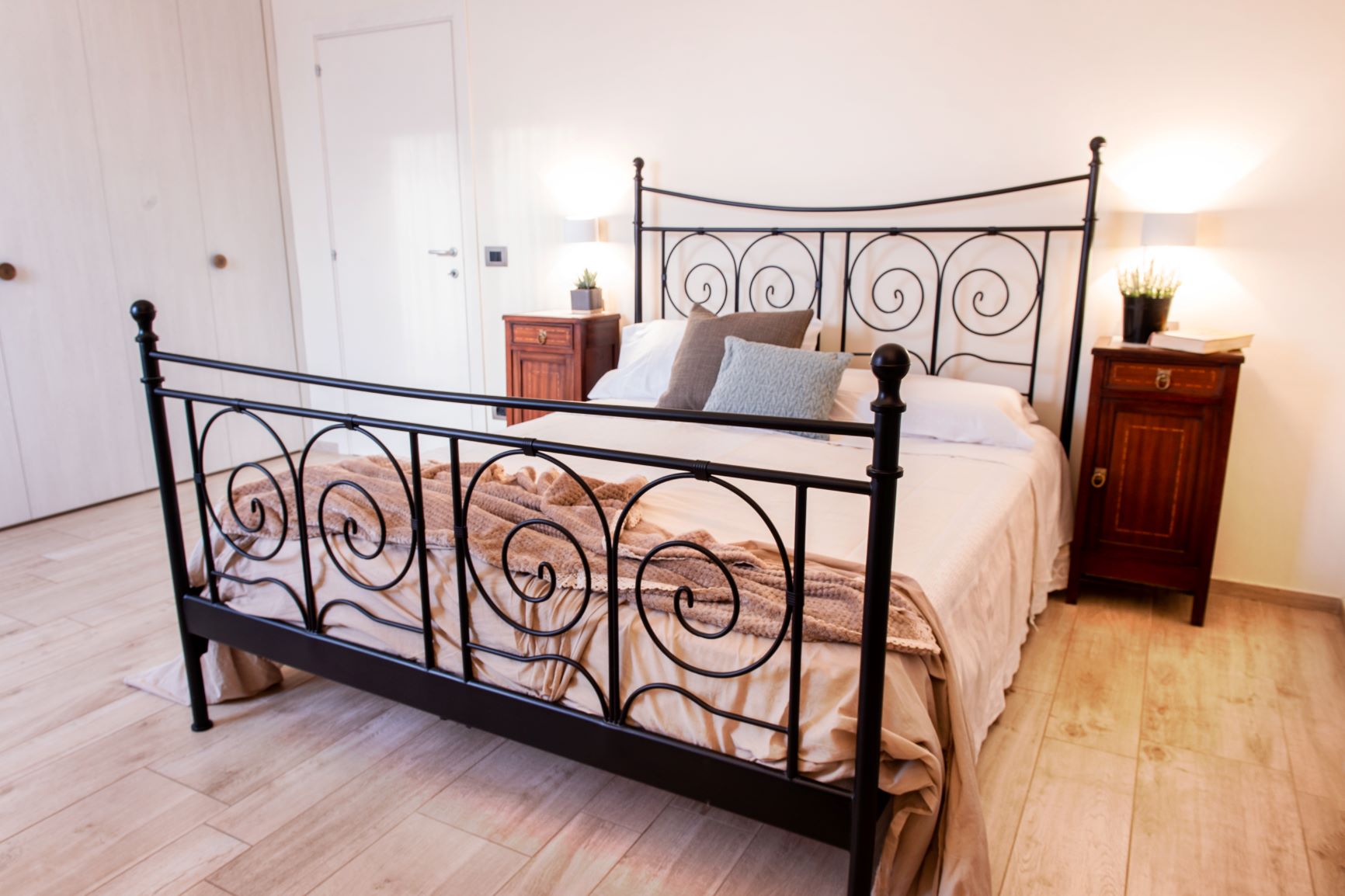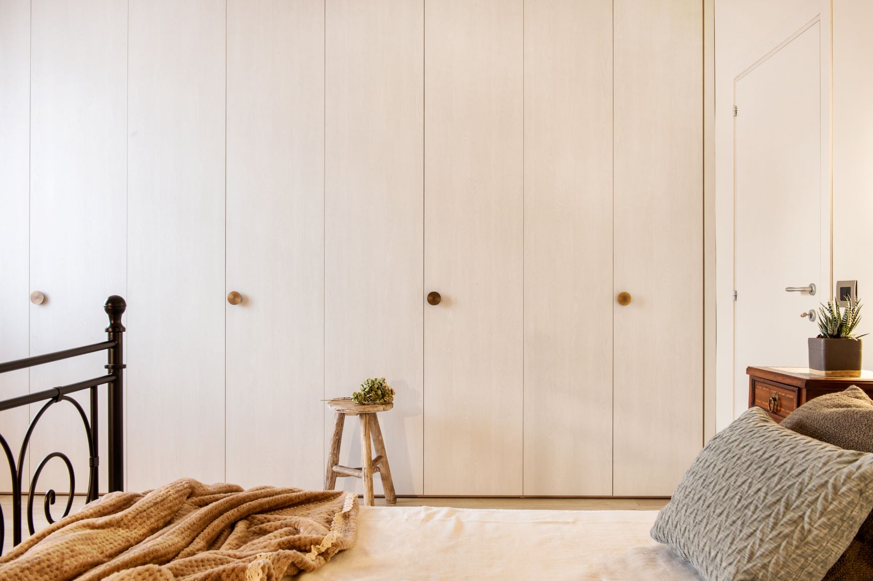 La camera è con armadio battente a parete in ecolegno rovere chiaro ingentilito e reso speciale da maniglie brunite. Letto e comodini erano già del cliente. Abbiamo aggiunto una poltroncina per i momenti di relax. Nell’insieme abbiamo ottenuto un connubio tra moderno e antico, tra funzionalità e romanticismo!